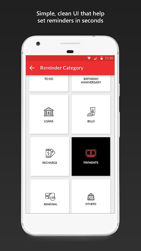 • Categorías que están hechas a medida para varios tipos de fechas de vencimiento: tareas pendientes, cumpleaños, préstamos, facturas, recargas, pagos y renovaciones.