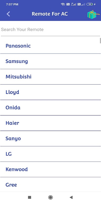 1- After download this Air conditioner Remote Control application , the first step is to choose your Air Conditioner brand name in the list .