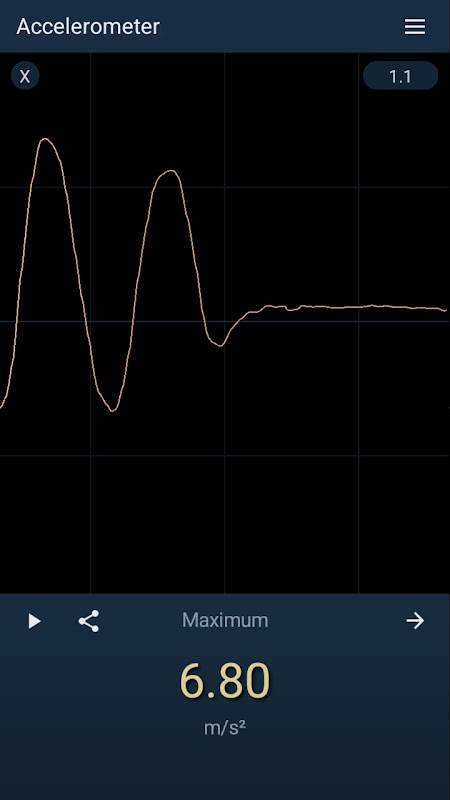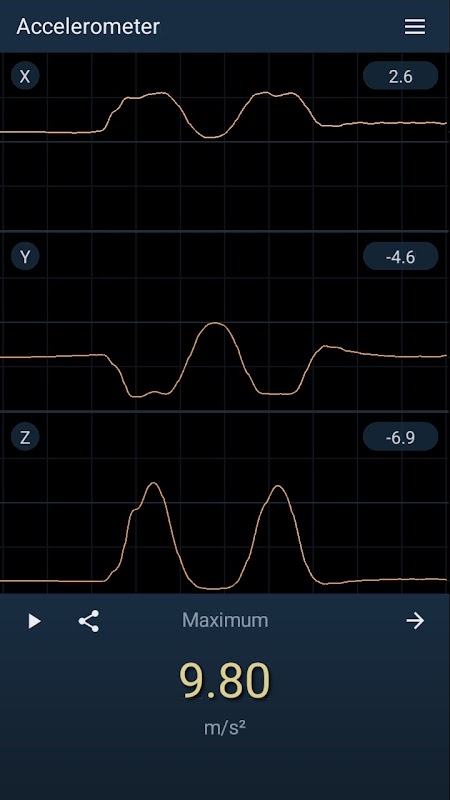 Esta sencilla aplicación muestra un gráfico de aceleración frente a tiempo en los tres ejes. Los tres componentes del vector de aceleración se leen continuamente en el sensor seleccionado; se pueden mostrar juntos en una sola cuadrícula o cada componente se puede mostrar por separado. Nuestra aplicación (orientación vertical, se requiere Android 6 o una versión más reciente) solo funcionará en teléfonos inteligentes que tengan al menos un sensor de aceleración, hardware o software. La aplicación Acelerómetro se puede utilizar para estudiar el campo gravitacional de la Tierra o para medir los movimientos y vibraciones del dispositivo móvil. Por ejemplo, es posible evaluar la frecuencia y amplitud de las vibraciones que se originan en diferentes fuentes, como máquinas pequeñas, la actividad sísmica o la aceleración lineal de un coche.