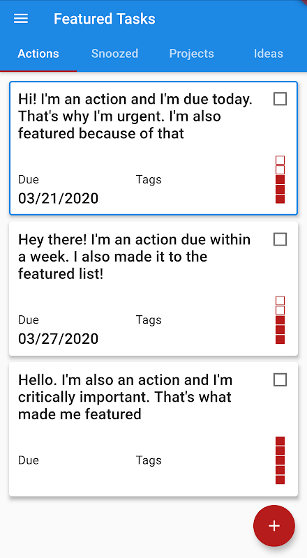 Task importance ranges between Marginal (the least important) and Critical (the most important). The options in the order of increasing importance are: Marginal, Low, Medium, High, and Critical. Task importance is visualized by a meter on the right side of a task card.
