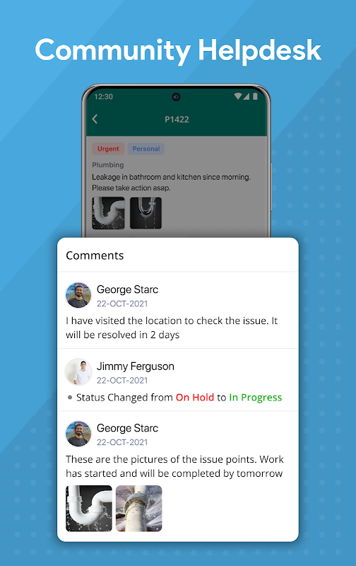 * Servicio de asistencia a la comunidad: asegure la satisfacción del cliente a través de una acción rápida en las solicitudes de servicio, consultas y quejas. Puede ver todas las solicitudes de Helpdesk que plantean los residentes de su Comunidad. También puede ver el estado del ticket y tomar medidas en función del estado. Puede proporcionar actualizaciones que estén disponibles para los residentes en su aplicación. El ciclo de vida de principio a fin de las solicitudes/quejas se puede gestionar mediante este módulo.