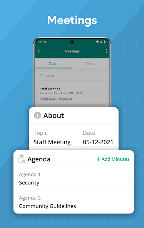 * Reuniones: tome decisiones más rápidas y mejores. Cree reuniones, tome notas, mantenga un historial de reuniones anteriores y más. Puede crear reuniones desde cualquier lugar y enviar notificaciones para asistir a las reuniones a los residentes o al personal de la comunidad correspondiente.