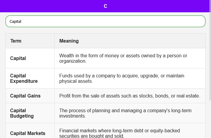 Potente funcionalidad de búsqueda: localice rápidamente términos y sus significados utilizando nuestra función de búsqueda avanzada. Ya no tendrás que desplazarte por listas interminables: simplemente escribe lo que necesitas y listo.