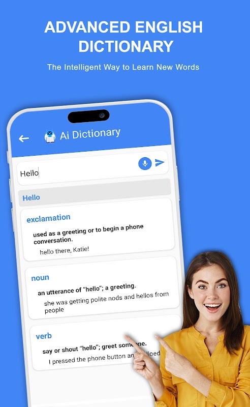 Traductor de voz añadido. Con él, puedes traducir lo que quieras, incluso con tu voz. Gracias a la función de traducción por voz, este diccionario es más útil que nunca. Este diccionario y traductor cubre todas tus necesidades. Puedes traducir de cualquier idioma a cualquier idioma. El Diccionario y Traductor de Inglés Avanzado admite tanto la escritura como la entrada de voz.