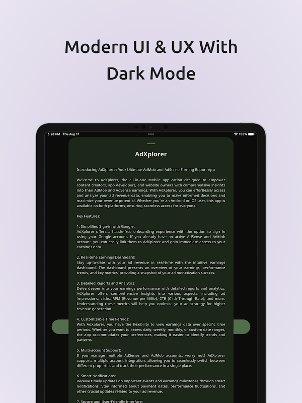 Con AdXplorer, puede acceder y analizar fácilmente sus datos de ingresos publicitarios, lo que le permitirá tomar decisiones informadas y maximizar su potencial de ingresos. Ya sea que sea usuario de Android o iOS, esta aplicación está disponible en ambas plataformas, lo que garantiza un acceso perfecto para todos.