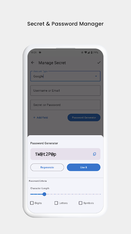 2. Administrador de secretos : Tienda integrada en la aplicación & administrar sus contraseñas y secretos. Viene con herramientas útiles como generador de contraseñas.