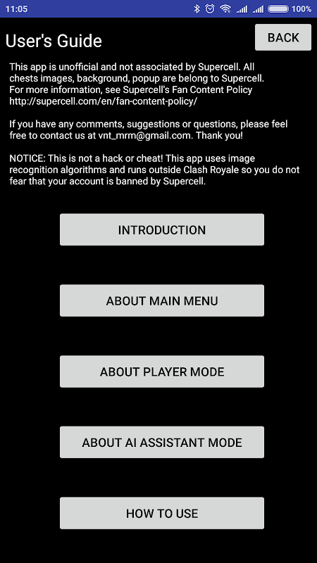 NOTICE: This is not a hack or cheat! This app uses image recognition algorithms and an AI (Artificial Intelligence) and runs outside Clash Royale so you do not fear that your account is banned by Supercell.