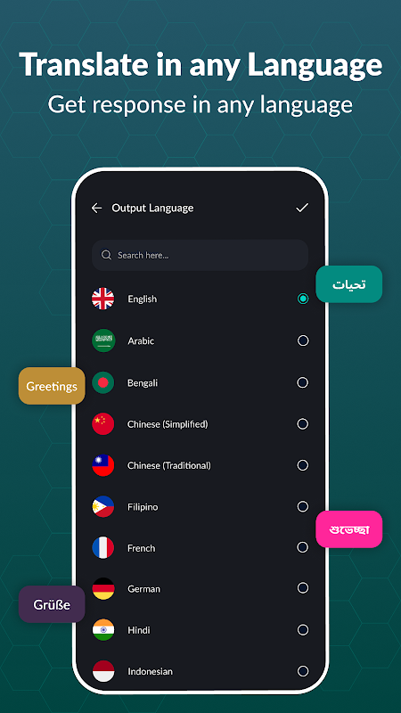 Traducción de texto: asistente virtual Chatbot - aplicación de mensajería de chat con IA En esta innovadora tecnología Chatbot - aplicación de IA, también puede traducir el texto generado en cualquier idioma después de generar contenido con la ayuda de este asistente de chat con IA: interactivo aplicación de chat. Si entiende algún idioma, puede obtener traducciones del texto generado.
