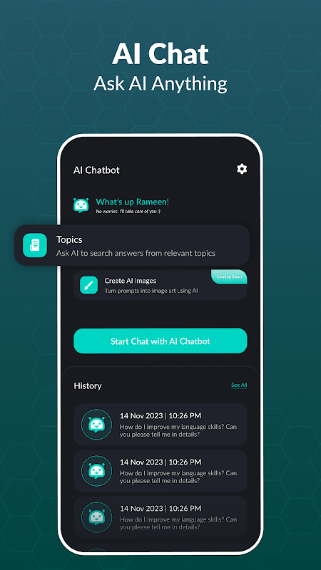 Pregúntele cualquier cosa al Chatbot: aplicación de chat similar a la humana Un aspecto notable de AI Communication AI es su capacidad para recuperar su historial de chat. El chatbot Ask Me Anything le permite volver a visitar conversaciones pasadas, lo que le permite continuar sin problemas desde donde las dejó por última vez.