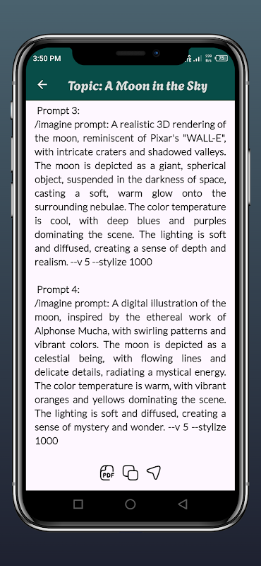 Da rienda suelta a tu imaginación con nuestra aplicación impulsada por IA que genera múltiples indicaciones basadas en tus ideas. 🖼️ Simplemente ingresa el concepto que desees, ya sea "Una lámpara sobre la mesa" o "Un gato a la luz de la luna", y observa cómo nuestros algoritmos avanzados crean una gran variedad de mensajes inspiradores. ✨