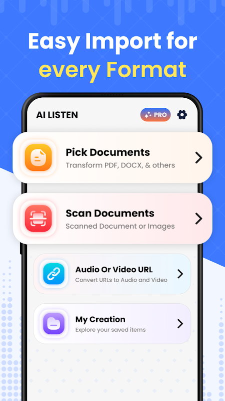AI Listen: App de Texto a Voz para convertir notas, PDF, documentos y texto web en voz clara y natural.