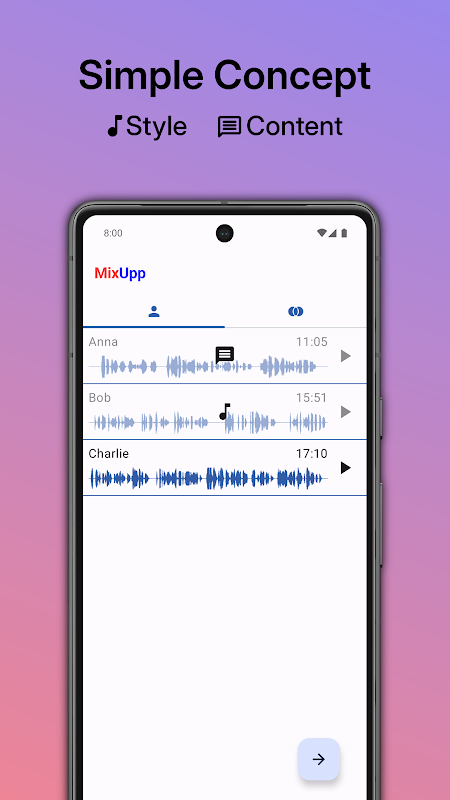 🎤 Voz a Voz: A diferencia de la mayoría de apps de modificación de voz con IA que usan texto a voz (obligándote a escribir para obtener una voz genérica), MixUpp funciona de voz a voz. Combina el estilo de un hablante con el contenido de otro para crear algo totalmente original.