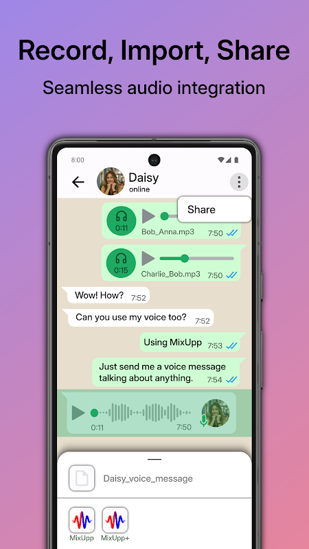 🎵 Graba e Importa Audio: Utiliza el micrófono integrado de tu teléfono para grabar un sonido, importa archivos de audio directamente desde tu dispositivo o comparte tu mensaje de voz favorito con MixUpp – Clonar Voz de Cualquiera y ¡ponte creativo!