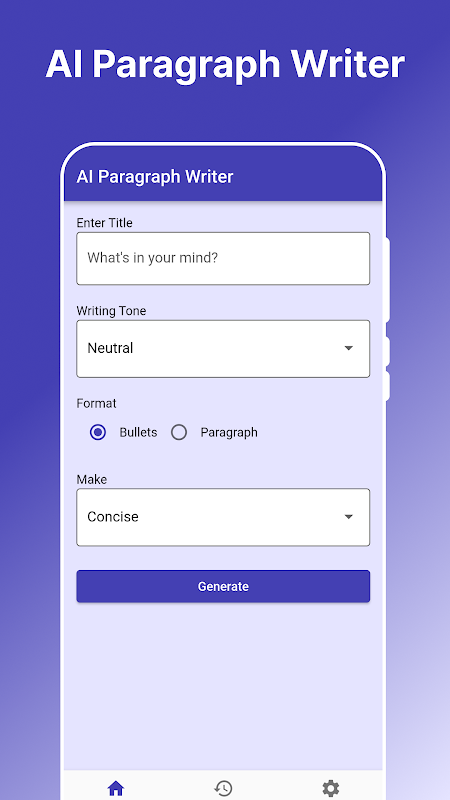 AI Paragraph Writer es una aplicación de Android fácil de usar para generar instantáneamente párrafos basados en IA sobre cualquier tema. El párrafo generado por IA está 100% libre de plagio. Este generador de párrafos AI te permite elegir diferentes tonos y longitudes.