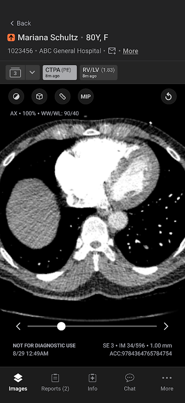 La aplicación de comunicación móvil Aidoc agiliza la comunicación para acelerar la toma de decisiones sensibles al tiempo y mejorar la calidad de la atención. La aplicación proporciona priorización basada en IA y notificación de una amplia gama de patologías agudas, incluidas las oclusiones de grandes vasos y las embolias pulmonares.