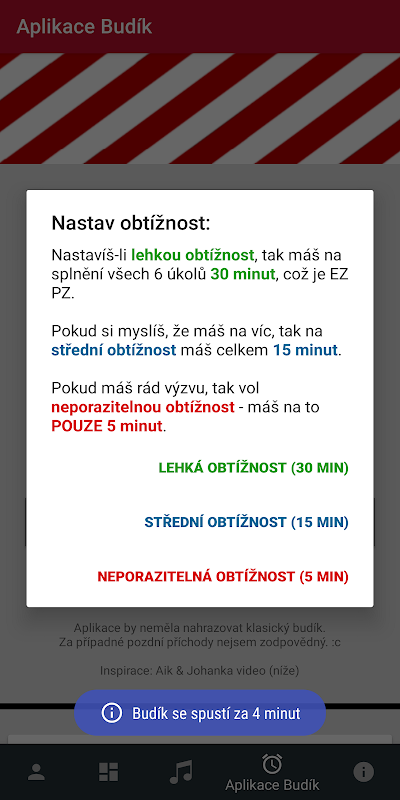 Při štelování budíku máš na výběr mezi 3 obtížnostmi - lehká (30 min na splnění úkolů), střední (15 min), neporazitelná (5 min).