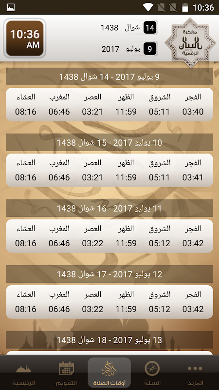 - Una alarma para diferentes momentos de culto (oraciones del viernes y del Eid - oraciones nocturnas - ayunos redundantes - recordatorios matutinos y vespertinos ... y otros).
