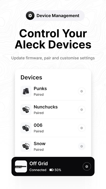 Conecta tus dispositivos Aleck como Off Grid, Snow, Nunchucks, 006 y Punks directamente a la app para gestionar la configuración, actualizar el firmware, emparejar dispositivos y personalizar tu experiencia. Aleck Connect garantiza que todo funcione a la perfección antes de que salgas.