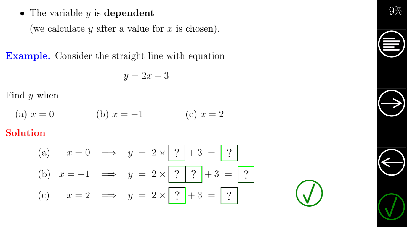 * Estudiar matemáticas se hace mejor trabajando con ejemplos y ejercicios. Hay muchos ejemplos interactivos y ejercicios en este tutorial que deben completarse para lograr un 100% de progreso.