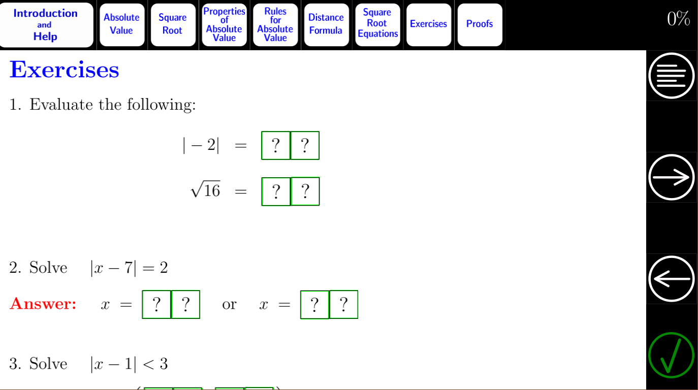 Tutorial interactivo de matemáticas para valor absoluto y raíz cuadrada