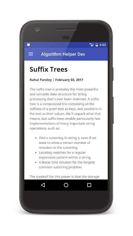 El contenido incluye material común de software entrevista, incluyendo algoritmos de grafos, árboles binarios de búsqueda, listas enlazadas, y la clasificación. Se presenta una visión para cada tema de una manera para móviles, junto con el acceso fuera de línea. Queremos que asimilar los conceptos básicos de estas ideas, incluso si usted está en movimiento. Nuestros guías son menos acerca de los hechos y más acerca de la intuición.