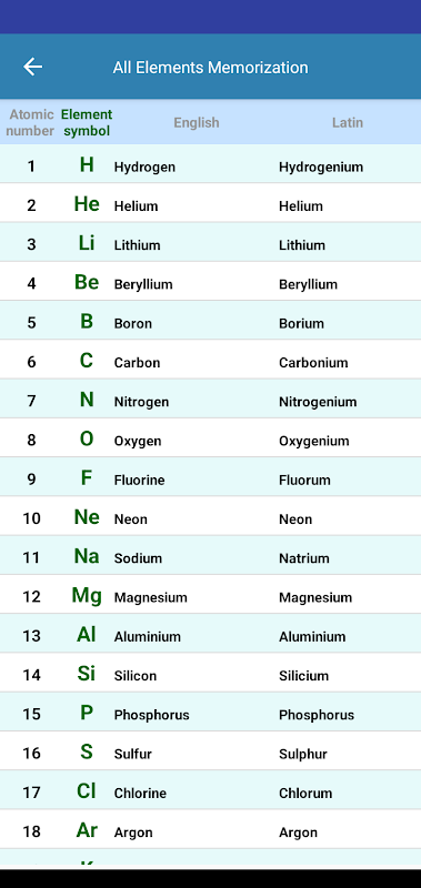 Esta aplicación admite memorizar todos los símbolos de elementos químicos desde el número atómico 1 hidrógeno (H) hasta el número atómico 118 oganesson (Og).