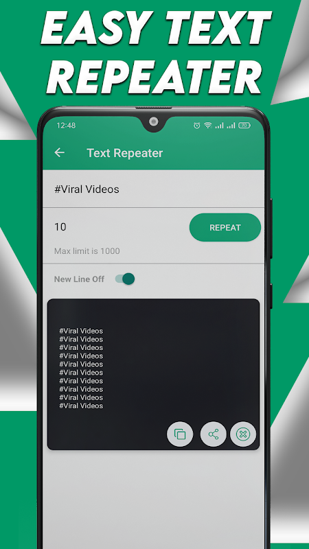 • Fácil de generar texto repetitivo y compartirlo con compañeros. Puedes repetir cualquier texto mil veces solo por escribir una vez usando un repetidor de texto.