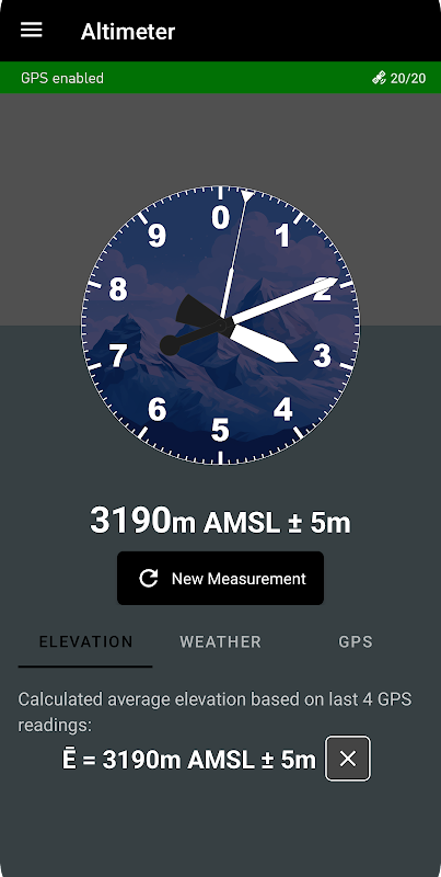 La aplicación Altímetro en realidad utiliza el GPS integrado de su teléfono para medir la elevación sobre el nivel del mar. No requiere conexión a internet. Debe saber que medir la elevación con dispositivos de consumo es propenso a errores. Para obtener la lectura más precisa de su teléfono, necesita una línea de visión clara con pocos satélites sobre usted y pocos en el horizonte. Esto es difícil de lograr en lugares urbanos.