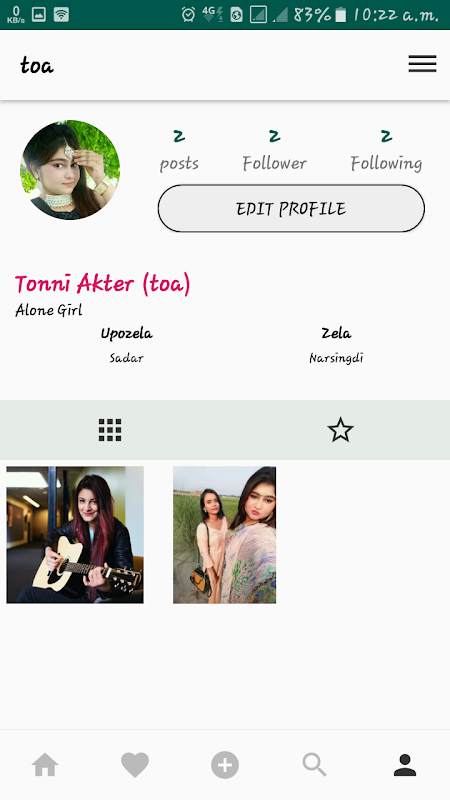 রেজিষ্টার্ড কৃত ইউসার তার প্রোফাইলে , সর্বোচ্চ একটি ছবি সহ ডেসক্রিপশন দিয়ে পোস্ট করতে পারবে। এবং সেই পোস্ট সে নিজে সহ তার সকল ফলোয়ার রা দেখতে পারবে।