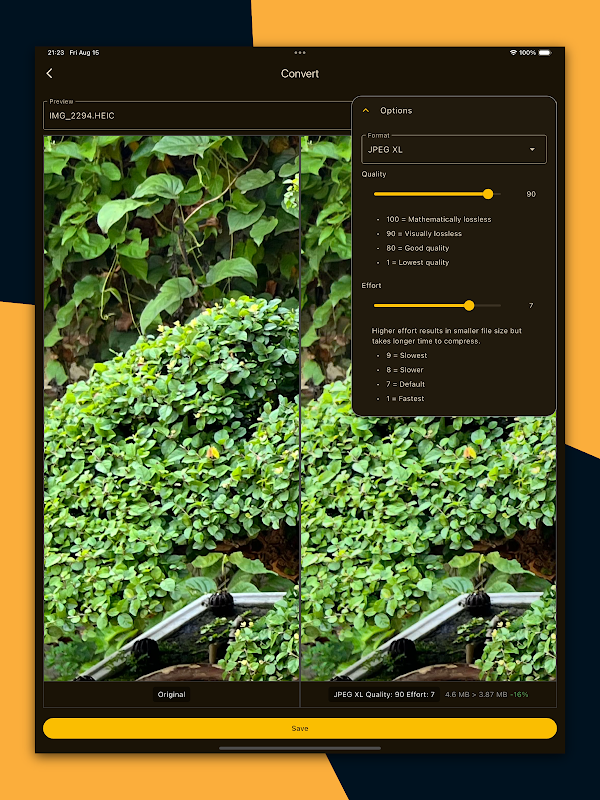 Compatible con JPEG, PNG, PNG de 8 bits, WEBP, HEIF/HEIC, AVIF, JPEG XL (JXL), etc.