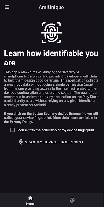 Esta aplicación tiene como objetivo estudiar la diversidad de huellas dactilares de los teléfonos inteligentes y proporcionar a los desarrolladores datos que les ayuden a diseñar buenas defensas. Esta aplicación recopila una huella digital anónima del teléfono inteligente sin utilizar ningún permiso (aparte del que proporciona acceso a Internet) relacionado con la configuración y el sistema operativo del dispositivo. El objetivo de nuestra investigación es comprender si alguna aplicación en Play Store podría identificar a los usuarios sin depender de ningún identificador ya presente en Android.