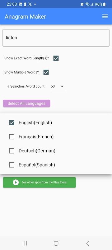 It can show anagrams and definitions in French, German, Italian, and Spanish, too.