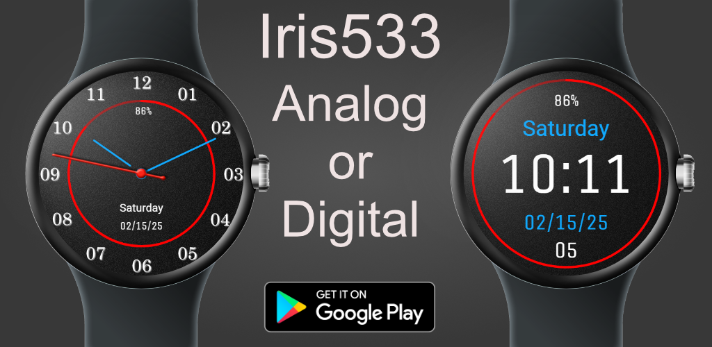 Iris533 es una esfera de reloj única y sencilla que es tanto analógica como digital. Proporciona la función básica de decir la hora en cualquier formato y proporciona alta visibilidad con opciones de color y selecciones de fondo. Está diseñado para relojes Android que utilizan API nivel 30 y superior.