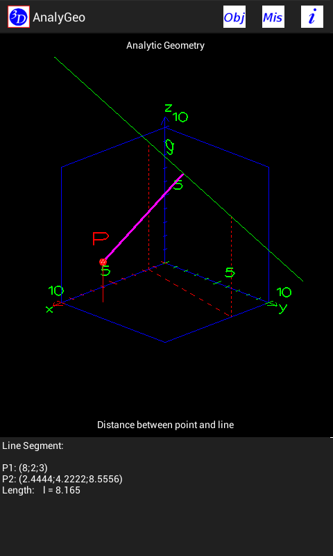El programa "Geometría Analítica" para Android ™ es un sistema flexible diseñado para la representación de objetos geométricos (sobre una base OpenGL) en un sistema de coordenadas 3D giratorio, utilizando paralelo o proyección central.