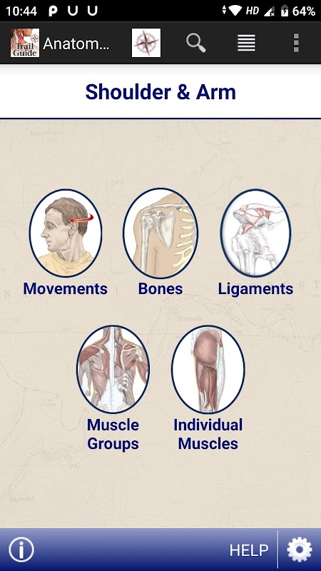 • Múltiples opciones para poner a prueba sus conocimientos de anatomía musculoesquelética: 1) respondiendo preguntas de opción múltiple (solo tarjetas de músculos) 2) localizando estructuras específicas y 3) identificando puntos AOIN. Las preguntas del cuestionario se desarrollaron a partir del libro de ejercicios Trail Guide to the Body.