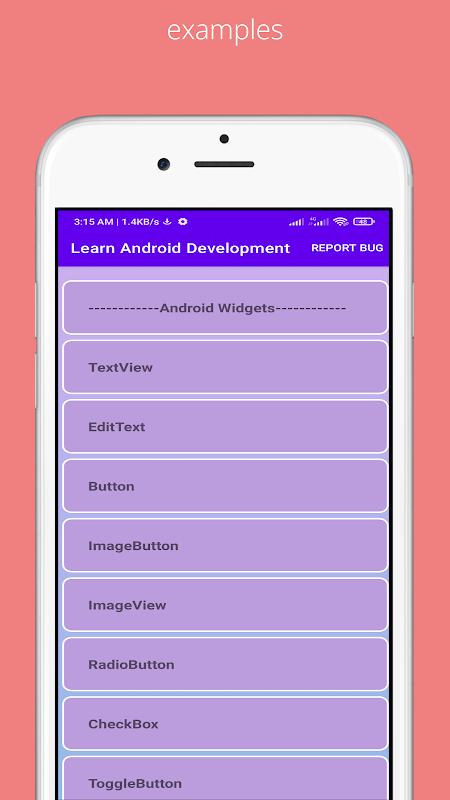 En esta sección, puede encontrar varios tipos de ejemplos disponibles con código xml y java. También puede ver la demostración directamente haciendo clic en el botón de reproducción en la sección de ejemplos. Mientras desarrollan aplicaciones para usuarios de Android, solo necesitan copiar y pegar los códigos en los archivos respectivos en Android Studio. Todos los ejemplos de Android se prueban y prueban en Android Studio IDE.