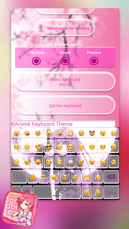 Prepárate para la mejor Anime Teclado Tema para tu dispositivo móvil! Los teclados de colores finalmente estan aquí! No pierdas más tu tiempo y apúrate para descargar los mejores teclados gratis para celular en el mercado! Si eres un fan de las peliculas japonesas anime, seguramente vas a adorar nuestro teclado de anime! Puedes elegir entre muchos diseños de colores del teclado emoji con chibi anime o chica anime y ser parte del mundo anime. Hemos creado increíbles temas de anime que te van a quitar el aliento. Escoge una de muchas “imagenes de teclados” y ilumina tu teléfono! Sé el primero en tener estos maravillosos teclados virtuales en tu celular o tablet y muestra a todos tus amigos y familiares!