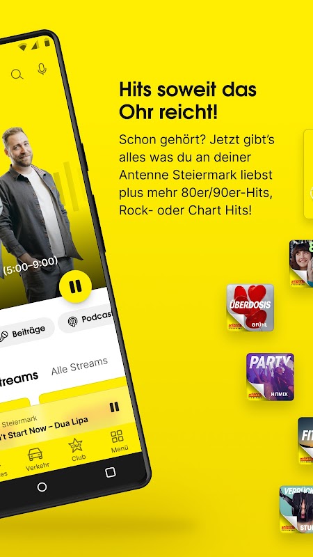 El mundo amarillo de Antenne Steiermark: ¡siempre y en todas partes! Con la aplicación Antenne Steiermark, ponemos en sus manos el mejor reproductor de radio y nuestro variado programa Antenne de música, entretenimiento y servicios regionales. También se incluye: Antenne Steiermark Club Advantage World. ¡Adelante!