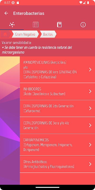 La aplicación AntibiogrAPP busca ser una herramienta útil en el día a día del personal médico en su área laboral y también de aquellos que se encuentran en entrenamiento para interpretar adecuadamente el antibiograma y así poder decidir que manejo antibiótico usar de forma adecuada según el aislamiento microbiológico obtenido. Adicional a esto, es una ayuda para conocer y recordar los mecanismos de resistencia. Se describe: