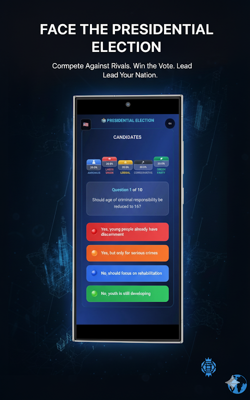 Esto no es solo un juego: es un simulador político realista donde deberás sortear decisiones complejas para sobrevivir. Equilibra la economía, gestiona las relaciones internacionales y mantén satisfechos a diversos grupos sociales para ganar las elecciones y afianzar tu legado.