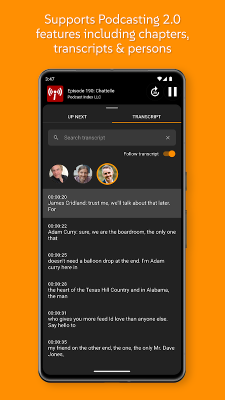 * Aparecen capítulos, enlaces de financiación y transcripciones para los podcasts que admiten Podcasting 2.0.