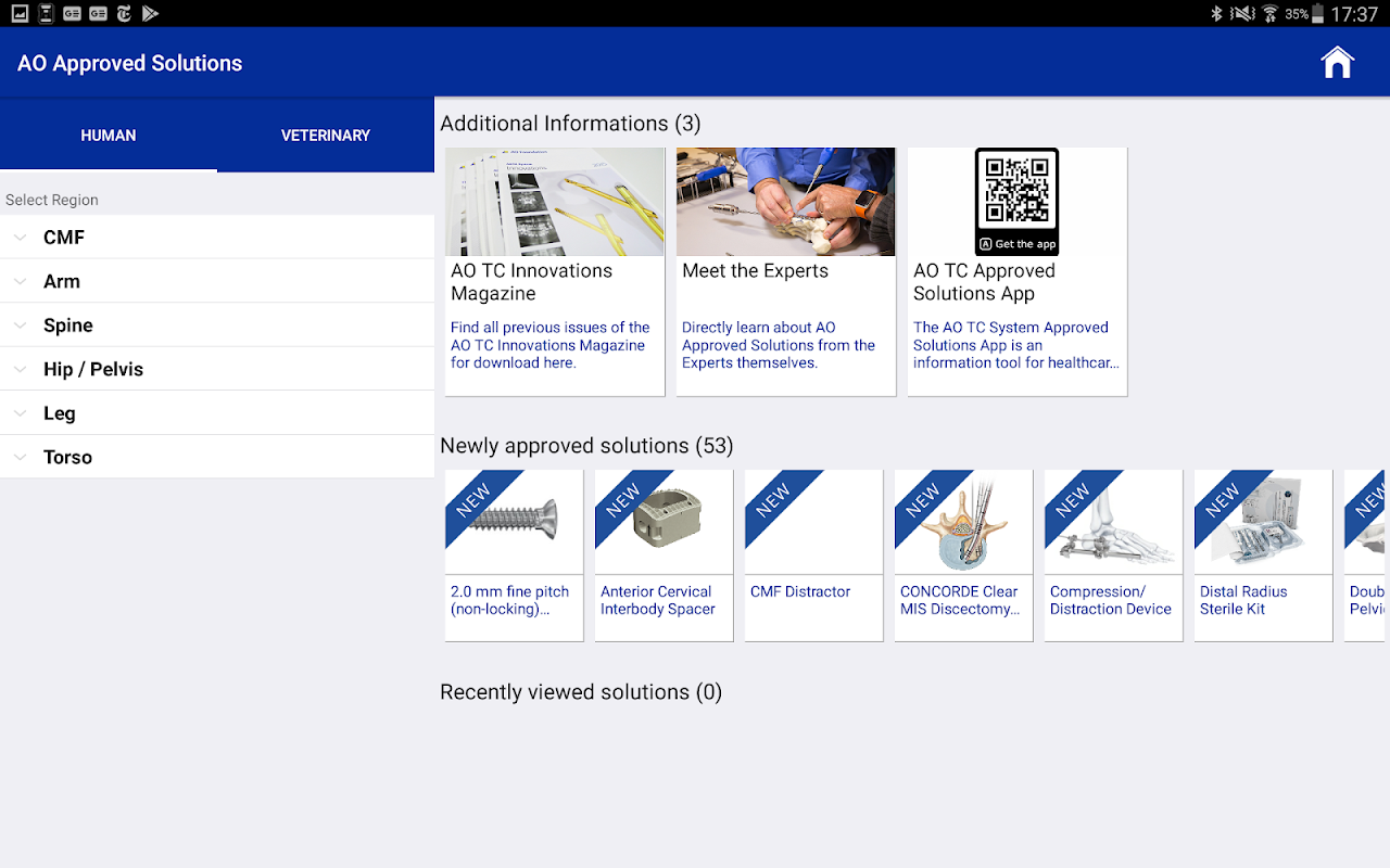 The AO TC Approved Solutions App is an information tool for healthcare professionals and engineers interested in new surgical solutions in the clinical areas of Trauma, CMF, Spine, Veterinary and Neurosurgery. It allows users to browse surgical products and technologies that have been approved by the AO TC System.