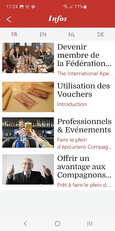 L'application mobile APERITIF est l'outil d'échange principal où chacun peut trouver en géolocalisation les établissements membres de la Fédération et les événements qui offrent ces avantages aux Compagnons de l'Apéritif.
