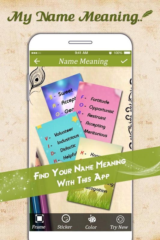 My Name meaning Application help you to check what is behind your name and make a picture with your name meaning.The information in your name can reveal your destiny.