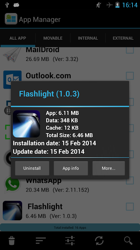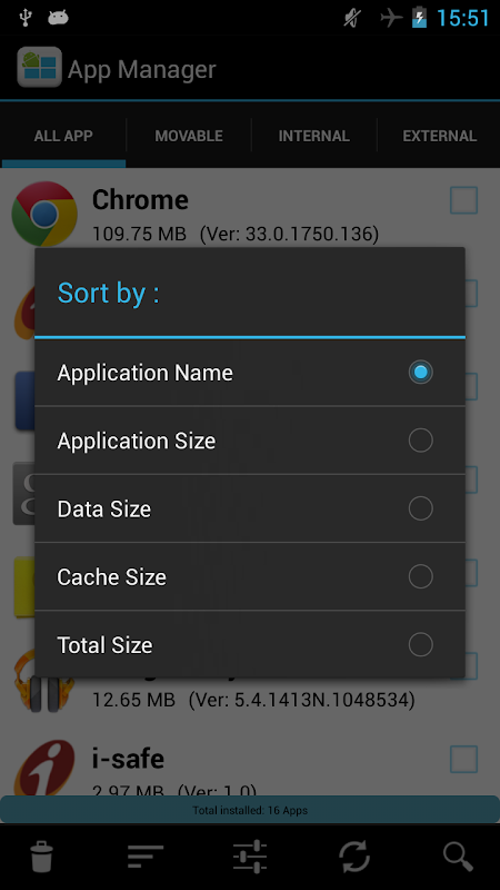 App Manager helps you to manage applications easily by providing categorized application view as Movable, Internal, External and Installer