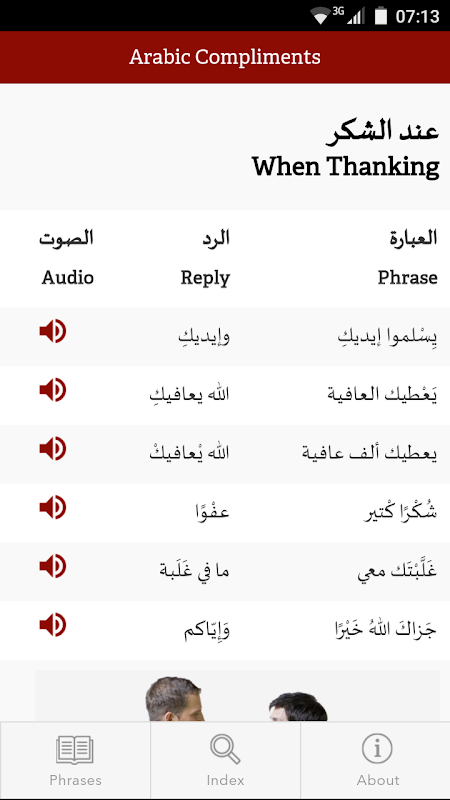 Usted encontrará una colección de dichos comunes relacionados con diferentes situaciones de la vida en árabe con traducción al Inglés. Para cada frase, que tendrá el texto árabe, traducción al Inglés y de audio de la árabe, organizada en las siguientes categorías: