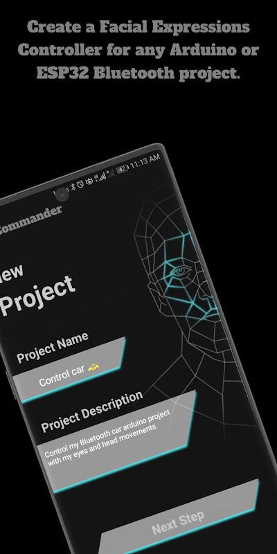 3- Selecciona la opción Nuevo Proyecto. El controlador Bluetooth Face Commander ahora lanzará una nueva actividad para ingresar el nuevo nombre y descripción del proyecto.