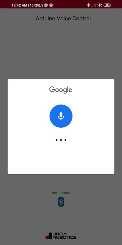 Con esta aplicación, puedes transmitir números enteros, caracteres o cadenas usando tu voz. Haga clic en el icono de Bluetooth para conectarse con uno de los dispositivos emparejados. Después de una conexión exitosa, puede hacer clic en el icono del micrófono para pronunciar la palabra o frase. Puede usar el siguiente programa en Arduino para leer la frase recibida en el monitor en serie.