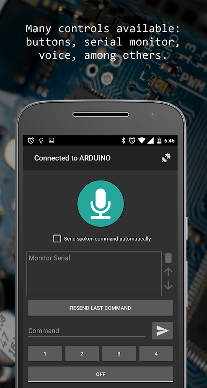 Through the +Arduino Control you can send voice and text commands to your Arduino via Bluetooth and still simplify your program. Thanks to the command map you will be able to make a simple logic in your Arduino, it works like this: you give a command to the app and it sends a code that you configure to your Arduino (e.g., when you say "on" the app will send "1" to the Arduino)!