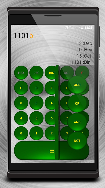 The application is designed for computer computing, in which you can add, subtract, multiply, divide and perform logical operations (XOR, OR, AND and NOT) with decimal, hexadecimal, octal and binary numbers. At the end of the number is a letter indicating the type of input number.